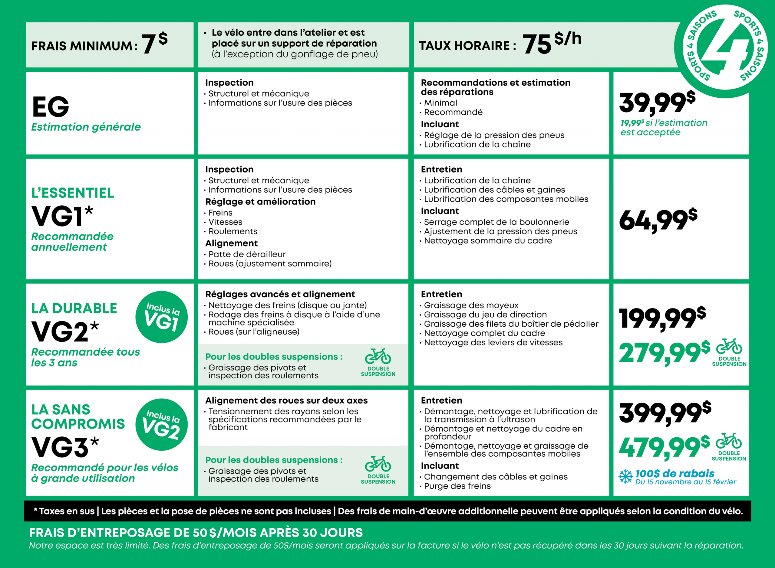 - Entreposage + ALIGNEMENT DES ROUES : 75$